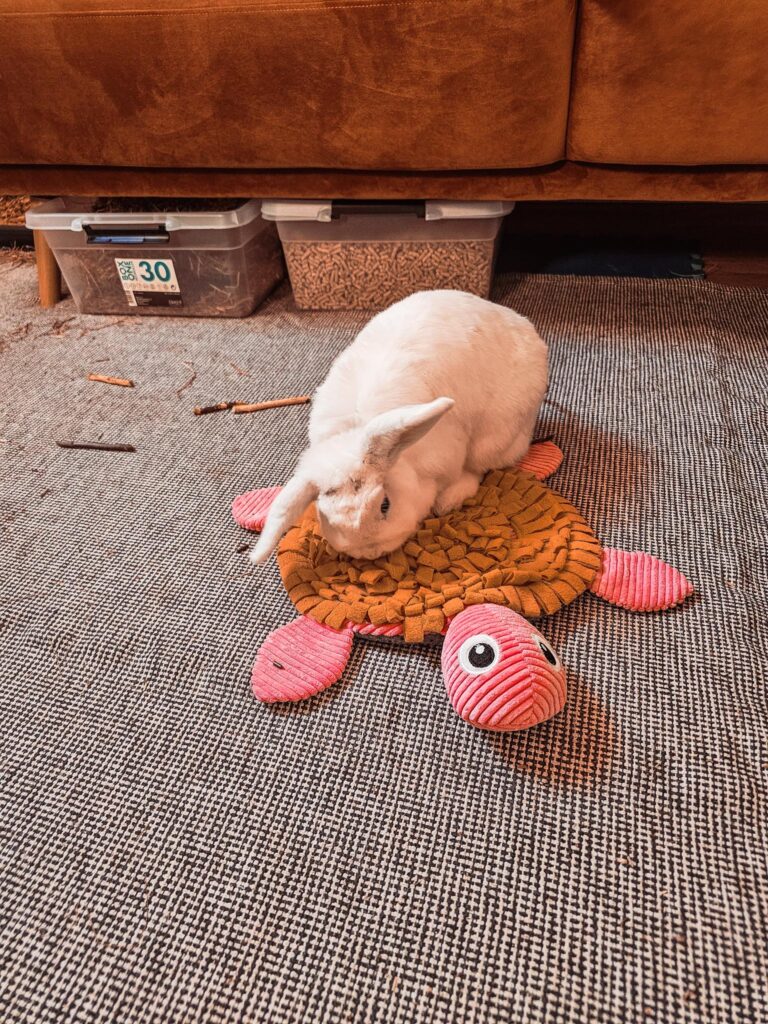 Beweegzone: hier moet ruimte zijn om te rennen, springen en binkies te maken. Voor extra uitdaging kun je zorgen voor een tunnel. Tunnels geven konijnen een veilig gevoel en nodigen uit tot spelen. Ook een snuffelmat, is een geweldige manier om hen mentaal bezig te houden en natuurlijk foerageergedrag te stimuleren.