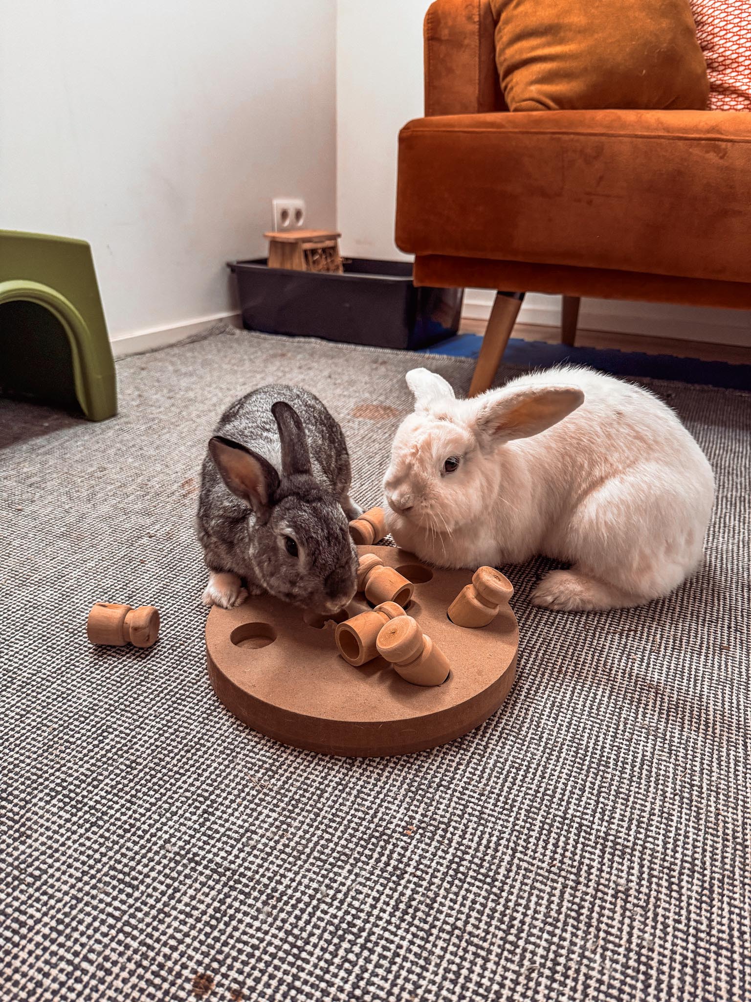 Een konijnenverblijf zonder verrijking is als een woonkamer zonder meubels, saai en leeg. En konijnen zijn slimme dieren die uitdaging nodig hebben. Verrijking kan bestaan uit bijvoorbeeld voerpuzzels, knaagspeeltjes, veilige takken of tunnels. Maar ook simpele dingen zoals een kartonnen doos of een wc-rol gevuld met hooi kunnen al voor veel plezier zorgen.