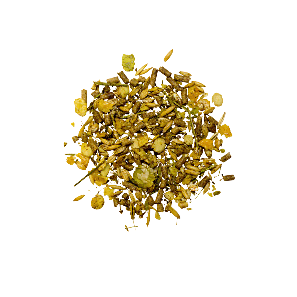 Maïsvlokken, sojavlokken, haver, gerstvlokken, haverzemelen, tarwevoermeel, bietenmelasse, tarwegriesmeel, gedroogd bietenmelasse, plantaardige olie uit koolzaad, geraff., gras, bij hoge temperatuur gedroogd, sojameel, luzerne, hoge temperatuur gedroogd, plantaardige olie uit koolzaad, geraff. gehard, calciumcarbonaat, erwtenvlokken, maïsvoermeel, monocalciumfosfaat, natriumchloride, magnesiumchloride.