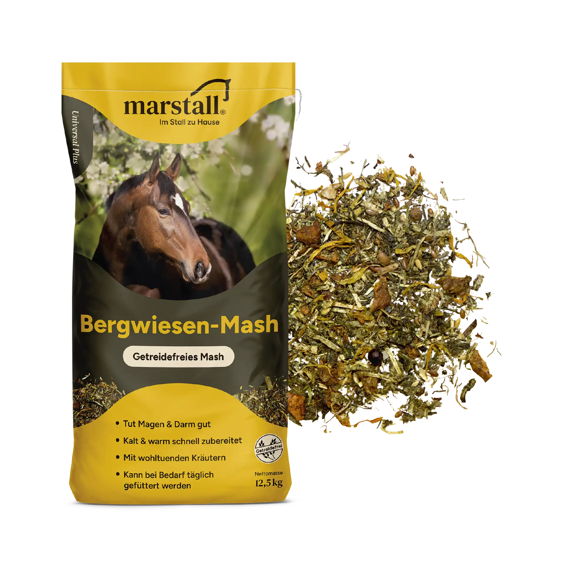 Marstall Bergwiesen-Mash: De graan- en melassevrije, suikerarme en licht verteerbare slobber! Rijk aan darmactieve, intelligente Marstall Previta-vezels met bewezen, prebiotische werking.