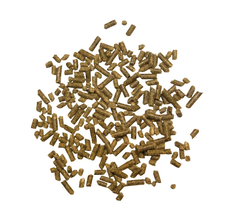 Lignocellulose (verkregen uit sparren), kunstmatig gedroogd gras, gedroogde cichoreipulp, plantaardige olie uit koolzaad, geraff., bietenpulp, kruiden (mariadistelzaden, brandnetelkruid, paardenbloemwortel, meidoornblad met bloesem, rozemarijnblaadjes, komijn)