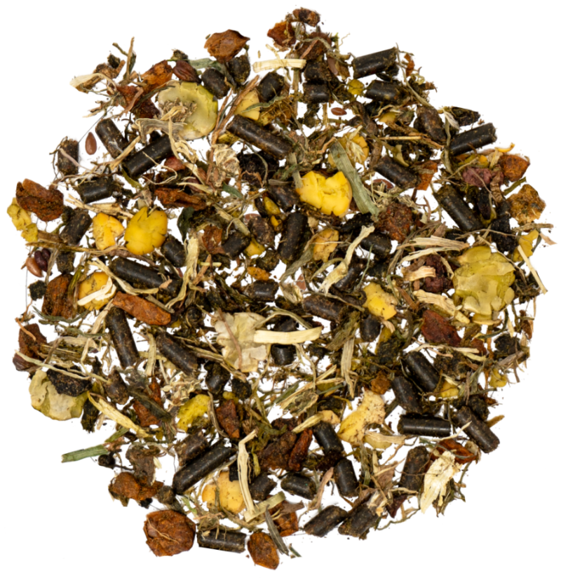 Gras (kunstmatig gedroogd), gedroogde druivenpulp, soja-extractiemeel, sojavlokken, lijnzaad (verteerd), plantaardige olie (koolzaad, geraffineerd), koolzaadextractiemeel, lijnzaadschilfers, erwtenvlokken, biergistcelwanden (Saccharomyces cerevisiae), monocalciumfosfaat, lijnzaad, calciumcarbonaat, natriumchloride, magnesiumoxide