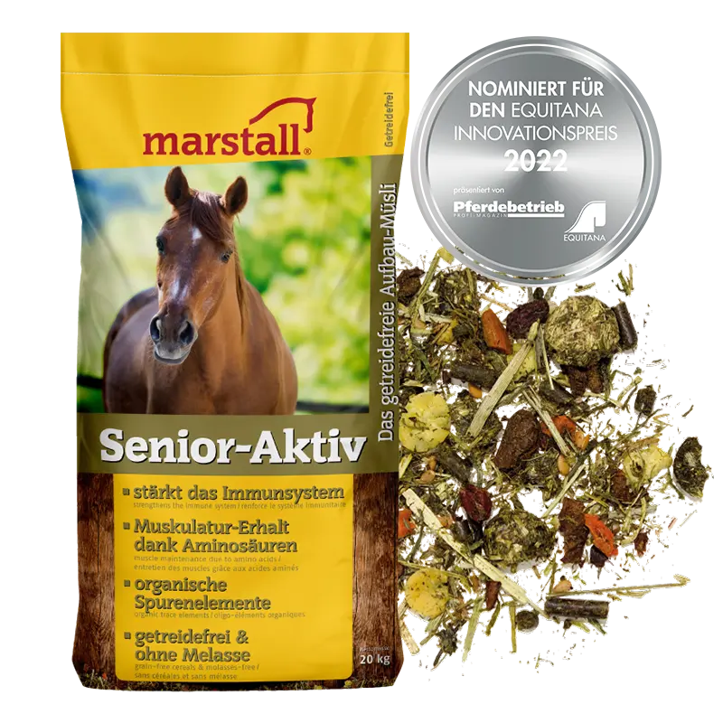 Marstall Senior-Aktiv: Graanvrije, licht verteerbare muesli die speciaal is afgestemd op de behoeftes van oude paarden. Het bevordert het onderhoud en de heropbouw van het paardenlichaam. Tegelijkertijd ondersteunt het de trager wordende spijsvertering en het immuunsysteem. Senior-Aktiv voorziet in de verhoogde behoefte aan vitamines en mineralen bij oudere paarden en stimuleert de kauwactiviteit. Dit komt zowel de maag als de psyche ten goede. De bewust verlaagde zetmeel- en suikerformule is ook ideaal voor paarden met een gevoelige stofwisseling.